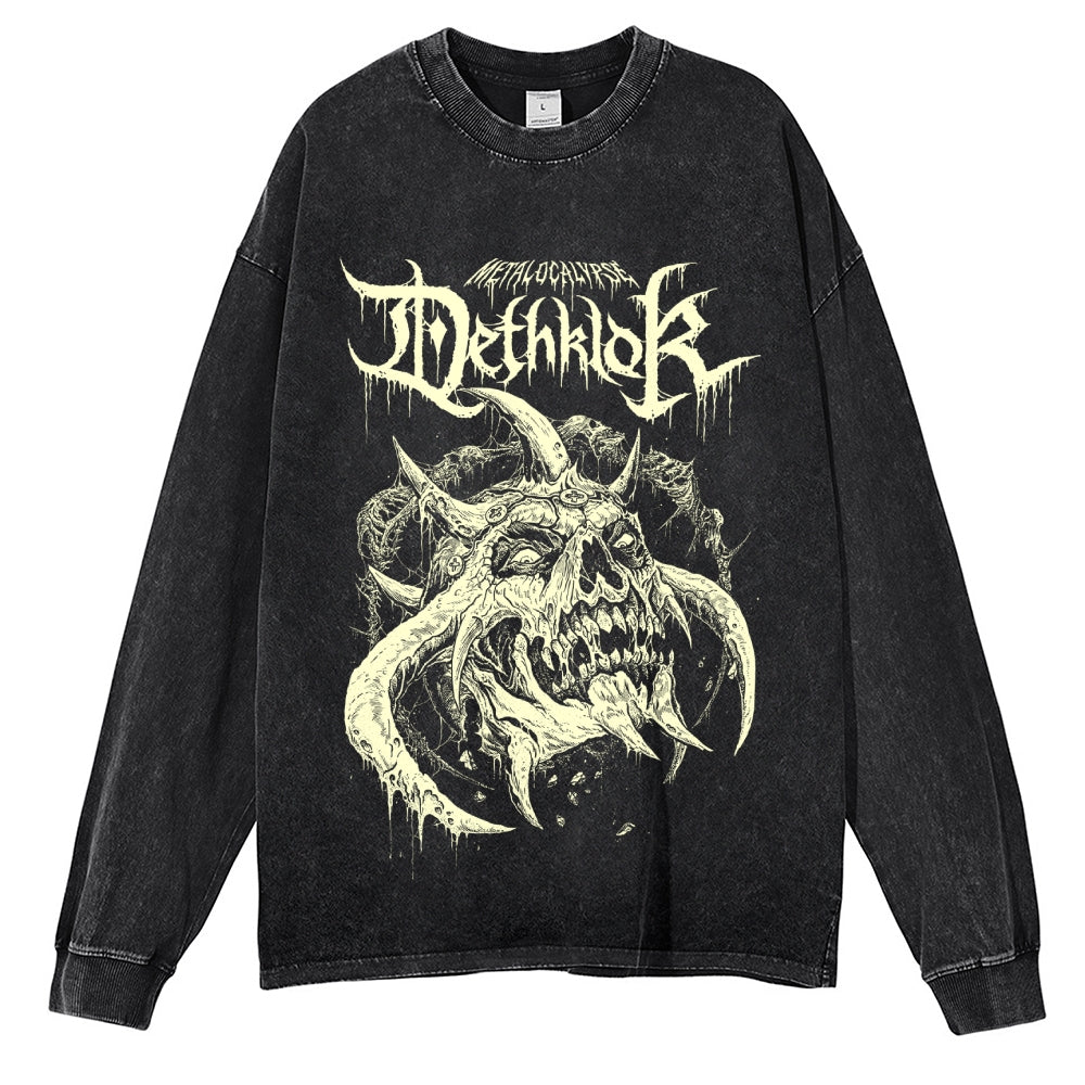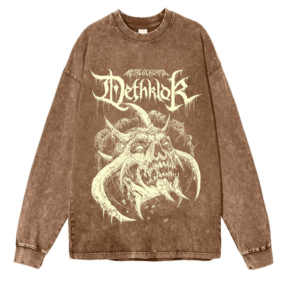 Heavy Metal Style Demon Pattern Washed Long-Sleeve T-shirt