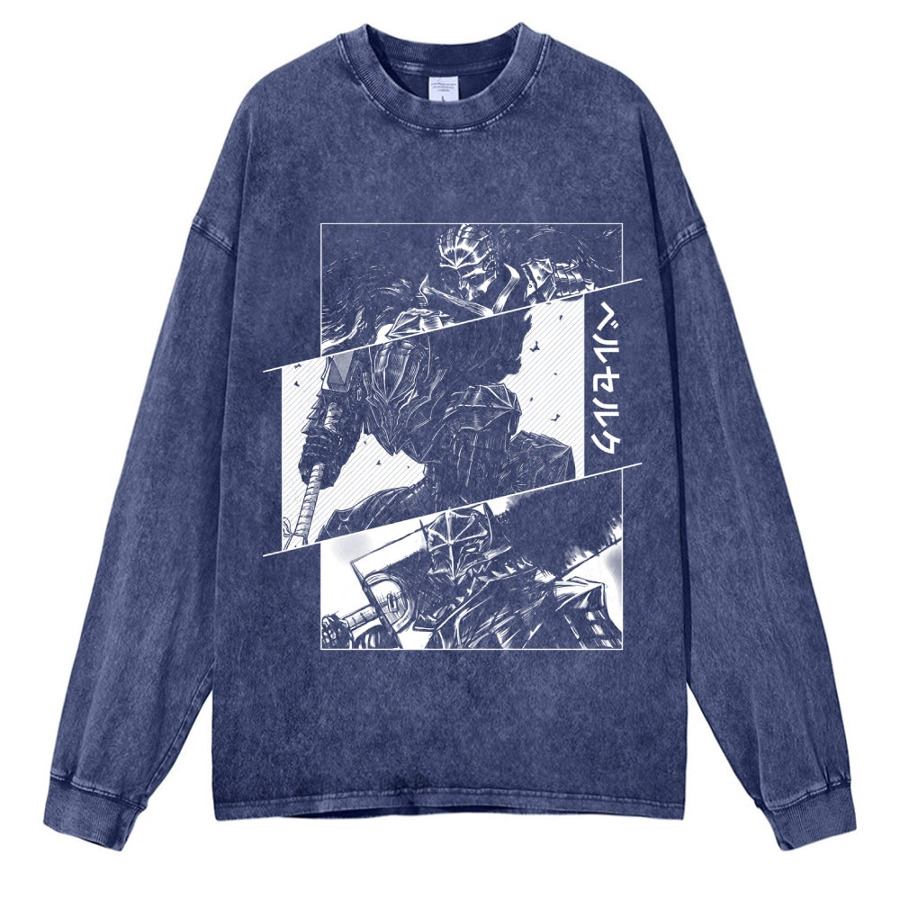 Anime Style Samurai Pattern Washed Long-Sleeve T-shirt